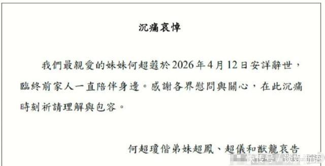 当普通人还在为工作、薪资焦虑时,坐拥百亿资产的赌王千金何超蕸却在59岁这一年去世了。 4月12日,赌王二房发出讣告,确认何超蕸去世的消息。一出来很多网友都挺震惊的,毕竟她去年11月才刚露过面,看起来也没什么异常,谁也没想到这么突然。 有港媒爆料称,何超蕸是因为乳腺癌复发离世的。 讣告的署名包括何超琼、何超凤、何超仪和何猷龙。 何超蕸走的前一晚,杨千嬅在演唱会上哭得特别伤心,来来回回哭了好几次,那时候大家都猜,她是被歌词戳中了心事,直到现在才明白,原来她是在为自己的好闺蜜何超蕸难过。 没人想到,一向低调、不爱出头的何超蕸,竟然和杨千嬅是闺蜜——两个人一个隐于豪门、默默做事,一个站在聚光灯下唱歌,看似毫无交集,却有着旁人不懂的深厚情谊。 其实争来争去,到头来竹篮打水一场空,生不带来死不带去,又有什么意义。 父亲是因,子女是果!父母造业,子女还…很多家庭都是这样的! 说白了就是兄弟姐妹里父母最不喜欢的孩子,最忽视的孩子,唯一是有钱在农村家里兄弟姐妹多的,里面也必须出现个最不讨喜,最被欺负的都是父母带的头。 据了解,何超蕸是赌王何鸿燊与二房太太蓝琼缨的第三个女儿,也是何家里比较低调的一位千金。她在父亲眼中,是很能帮忙的女儿。 何超蕸毕业于美国佩珀代因大学,算是家里的“学霸”,生前在德信集团担任执行董事,她性格一直很低调、温和,不爱争抢,所以平时很少出现在媒体上。 何超蕸从小脾气就特别好,软乎乎的,连亲妹妹都不怕她,一点架子都没有,长大以后,姐姐何超琼、何超凤都是家族里说一不二的话事人,走到哪儿都风光无限;妹妹何超仪一头扎进娱乐圈,活得潇洒又自在,想做什么就做什么。 唯独她,低调得不像赌王家的女儿——身材发福不刻意管理,穿得也简简单单、普普通通,跟赌王家族里那些光鲜亮丽、精致讲究的人比起来,显得格外格格不入,一点豪门千金的架子都没有。 大家也知道,何家子女的婚姻大多不太顺利,二房里,只有何超仪和何猷龙的感情比较稳定,何超琼和何超凤都经历过离婚。 何超蕸一生没有结婚,也没有子女,所以这次讣告里只提到家人陪伴,没有提到配偶和孩子,值得一提的是,2024年她还在香港被任命为太平绅士,那也是她晚年比较少见的一次公开露面。 何超蕸是美国佩珀代因大学毕业的,拿的是大众传播和心理学双学位,一辈子都专心打理家族生意、做公益,从来没传出过什么绯闻。 在二房五个姐弟里,她是最低调的一个,所以大家都很熟悉何超琼、何超仪,却很少有人知道,何超蕸在2022年还拿到了银紫荆星章。 她跟赌王的感情也特别好,虽然不像姐姐何超琼那么风光耀眼,但在赌王心里,她同样很优秀。 三年前,她还被授予香港大学专业进修学院名誉院士,她和赌王的这张合影笑得特别温馨,五官长得也最像赌王。 前些年,何超蕸聊起过父亲何鸿燊的长相,很多人都说他五官深邃,看着像外国人,不太像中国人。 但何超蕸并不这么觉得。她从小受父亲影响很深,赌王一直很看重传统文化,就算子女都在国外读书生活,也要求他们守好中华礼仪。 二房几姐妹的感情,在豪门里一直算得上是模范,相处得特别和睦,何超蕸拿荣誉院士的时候,全家人都到场为她撑场;2024年她被授予太平绅士,信德集团还专门发声明祝贺她。 她这一走,对何超琼、何超凤来说,就像被剜走了一块心头肉——那个从小一起长大、一直默默在身后帮衬她们的妹妹,再也回不来了,临终前,姐姐和弟弟一直守在她身边,紧紧握着她的手,陪她走完最后一程,这也算是她人生最后一段最温暖的时光了。 讣告出来那天,我随手搜了下她的名字,跳出来最多的标签都是“何鸿燊二房女儿”“何超琼妹妹”。翻了几篇以前的报道,照片里她总是站在姐姐身边,微微低着头,双手交叠放在小腹前,安安静静的。 没人写过,2019年她一个人跑去云南,帮东华三院对接当地养老中心,一待就是三个月做试点;也没人提起,2022年她悄悄把自己在尖沙咀的两套物业,改成十年不涨租,低价租给了社区精神康复中心。 最后是何超琼、何超凤、何超仪、何猷龙四个人联名发的讣告,没提三房四房,也没提赌王留下的那些信托家产。就跟她这辈子一样,事做完了,人就往后退,连个多余的影子都不肯留下。 到目前为止,何鸿燊四房17个子女中已经有三位去世了:大房的何猷光、何超英和这次离开的何超蕸。这个数字看起来很扎眼,每个人的轨迹都是不一样的, 如今还在世的就只剩11位了。这11个人里,二房就占了5个,看着人最多、权势也最重,可再往下看第三代,就特别尴尬——赌王的亲孙子,居然只有何猷君和奚梦瑶生的何广燊这一个。 以前大家总调侃奚梦瑶“母凭子贵”,说她是撞大运挤进豪门的幸运儿,现在回头看,这话还真不是随便说说的。 何超蕸没有陷入遗产争夺之中,也并没有引发长期的舆论风波,在她的生涯里一直保持一种平静的状态:读书、从事企业管理工作、担任公务员职务以及投身于慈善事业中来,生活十分安稳。 当人们习惯于关注名流八卦的时候,何超蕸这样的角色常常被忽视。 据香港媒体爆料,何超蕸后续会择一个吉日,安葬在香港摩星岭的何家家族墓园里,从此安安静静陪伴在父母身边。 愿她一路走好,天堂再无病痛,往后皆安!